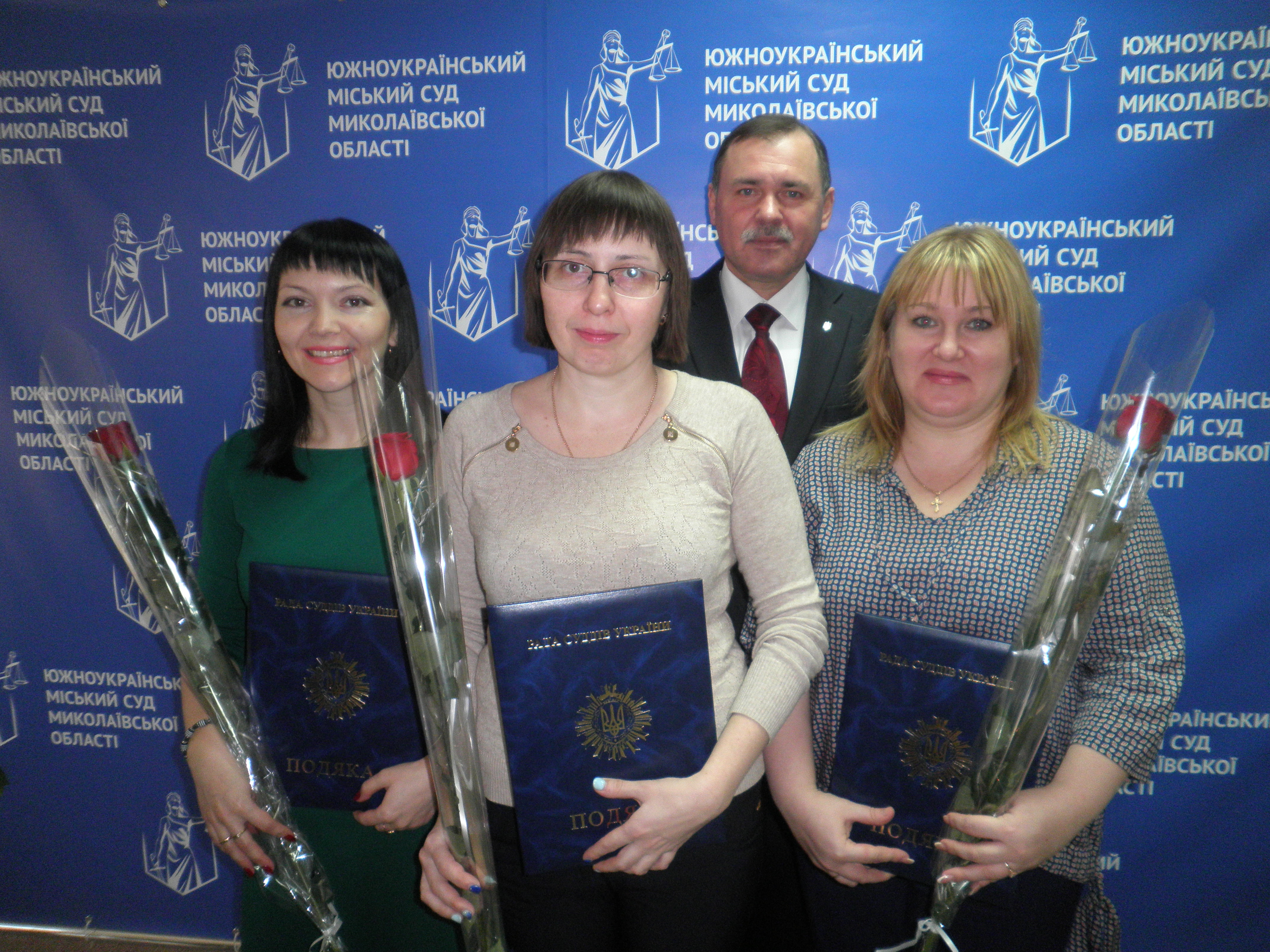 16 січня 2018 року в Южноукраїнському міському суді відбулася урочиста нарада з нагоди нагородження Подяками Ради суддів України помічників суддів Шевченко Тетяну Валеріївну, Жилу Наталю Михайлівну та Мураль Ольгу Миколаївну за значний вклад у зміцнення авторитету судової влади, високий професіоналізм та з нагоди професійного свята — Дня працівників суду (рішення РСУ №79 від 07.12.2017 року).