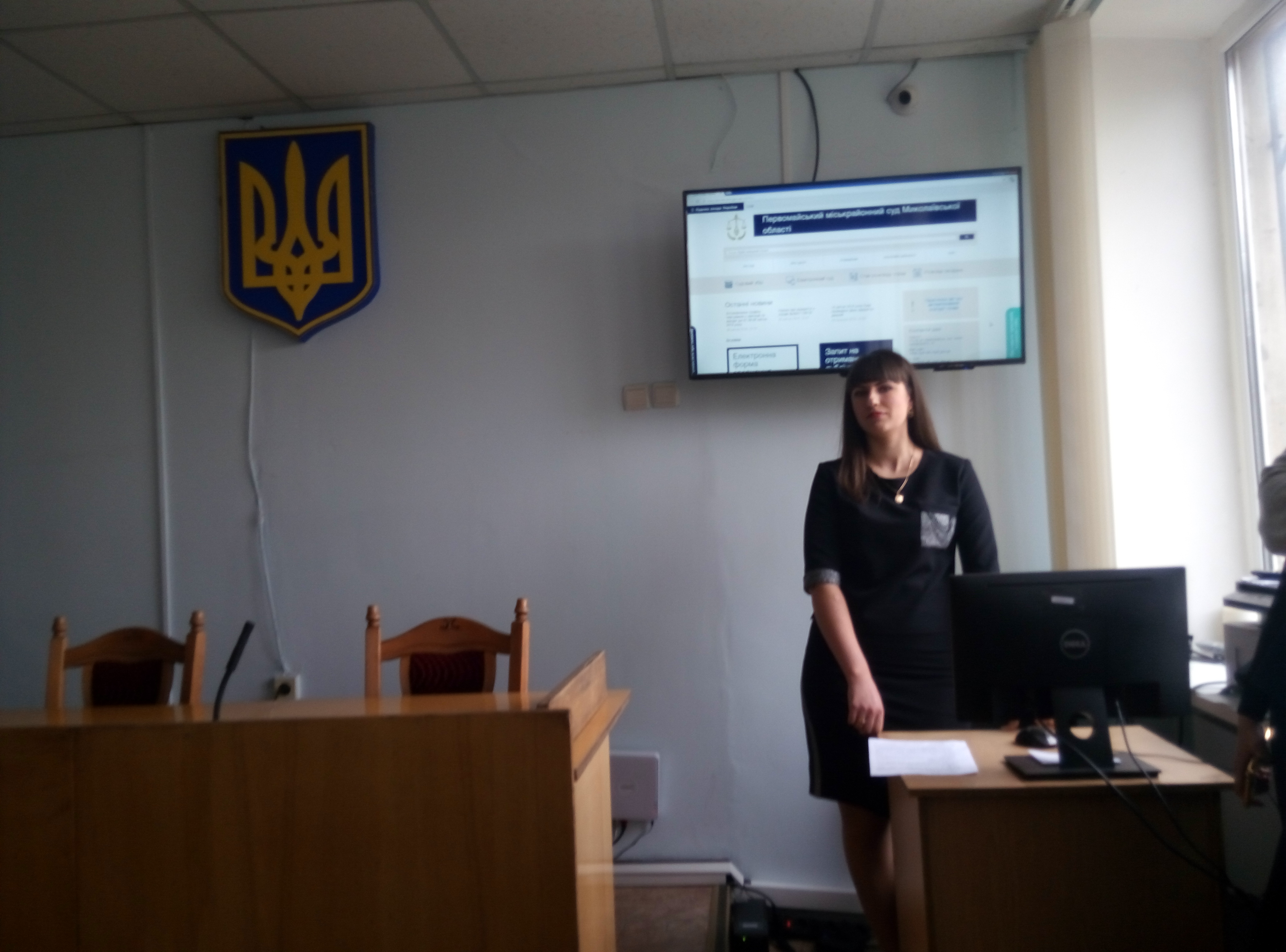 Коли всі студенти розмістилися у залі, Тетяна Яківна розповіла про те, як розподіляються справи між суддями, у якому вигляді надходять до суду та які умови висуваються до сучасного обладнання залу засідань. З порядком роботи  у   комп’ютерній програмі   Д-3, порядком реєстрації справ різних категорій, ознайомив провідний спеціаліст з інформаційних технологій Беженуца О.І. Також, було оглянуто веб-сайт суду, продемонстровано судове засідання у режимі відеоконференцзв’язку. Секретар судового засідання Лянгорт З.О. розповіла студентам про засоби фіксування судового процесу.