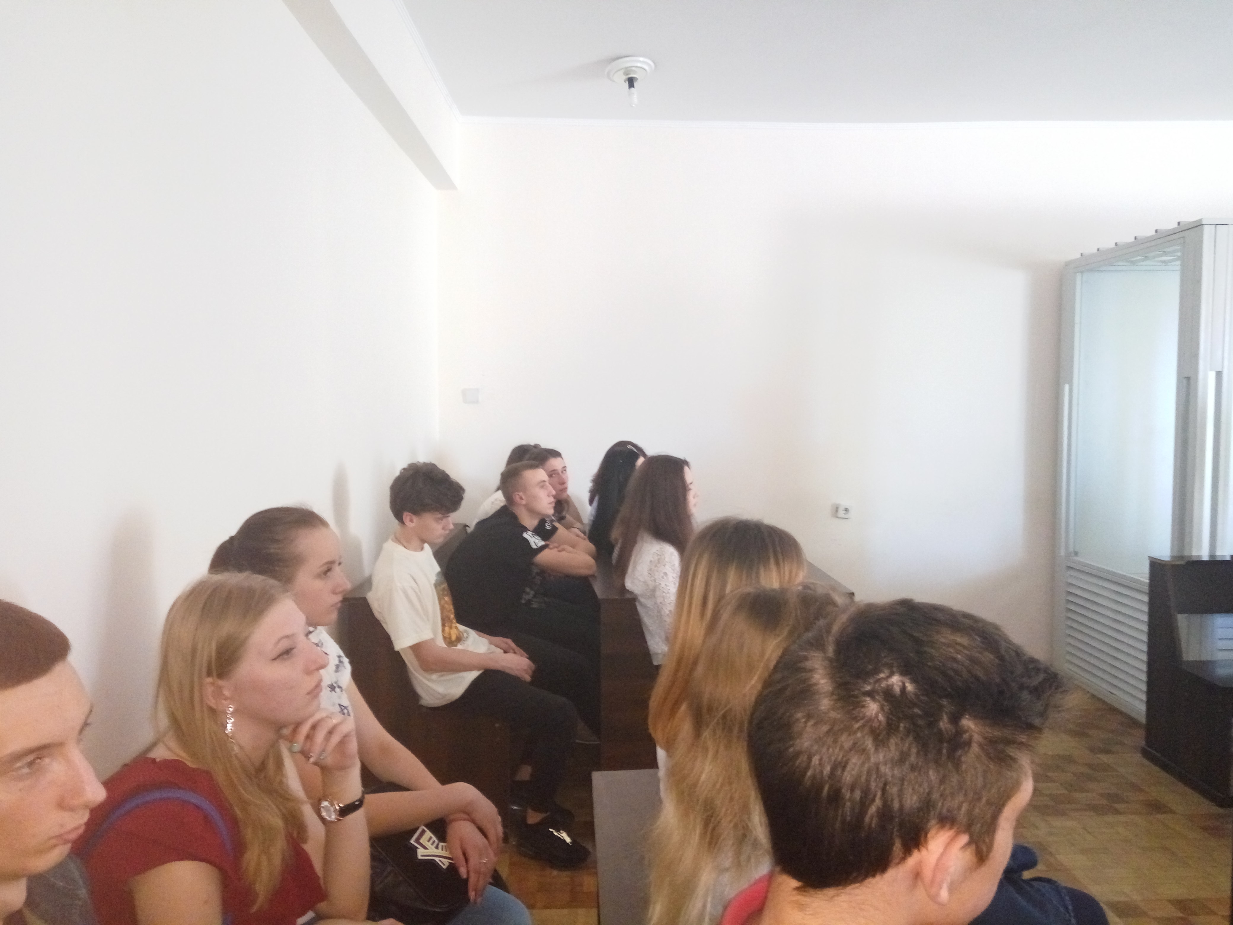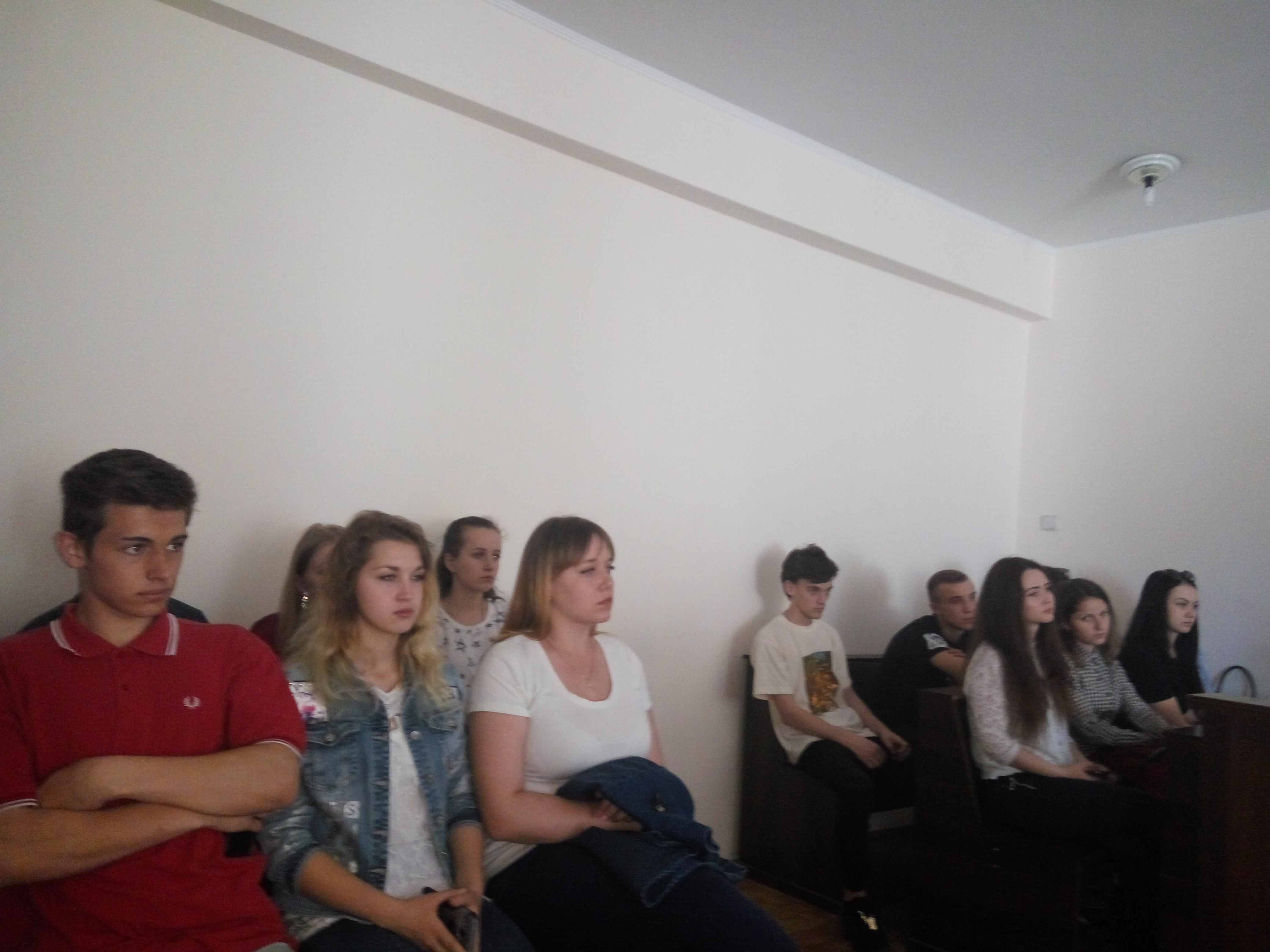 Помічник заступника голови суду – Алла Плінська розповіла про організацію суду вцілому, показала приміщення суду, зали судових засідань, розповіла про новітні технічні можливості, що застосовуються в роботі суду. Також студенти побували під час проведення судового засідання колегією суддів, після чого змогли задати питання щодо особливостей розгляду найбільш поширених категорій справ. Приємно, що найбільше питань стосувалось можливостей частіше відвідувати судові засідання не у складі організованих груп.