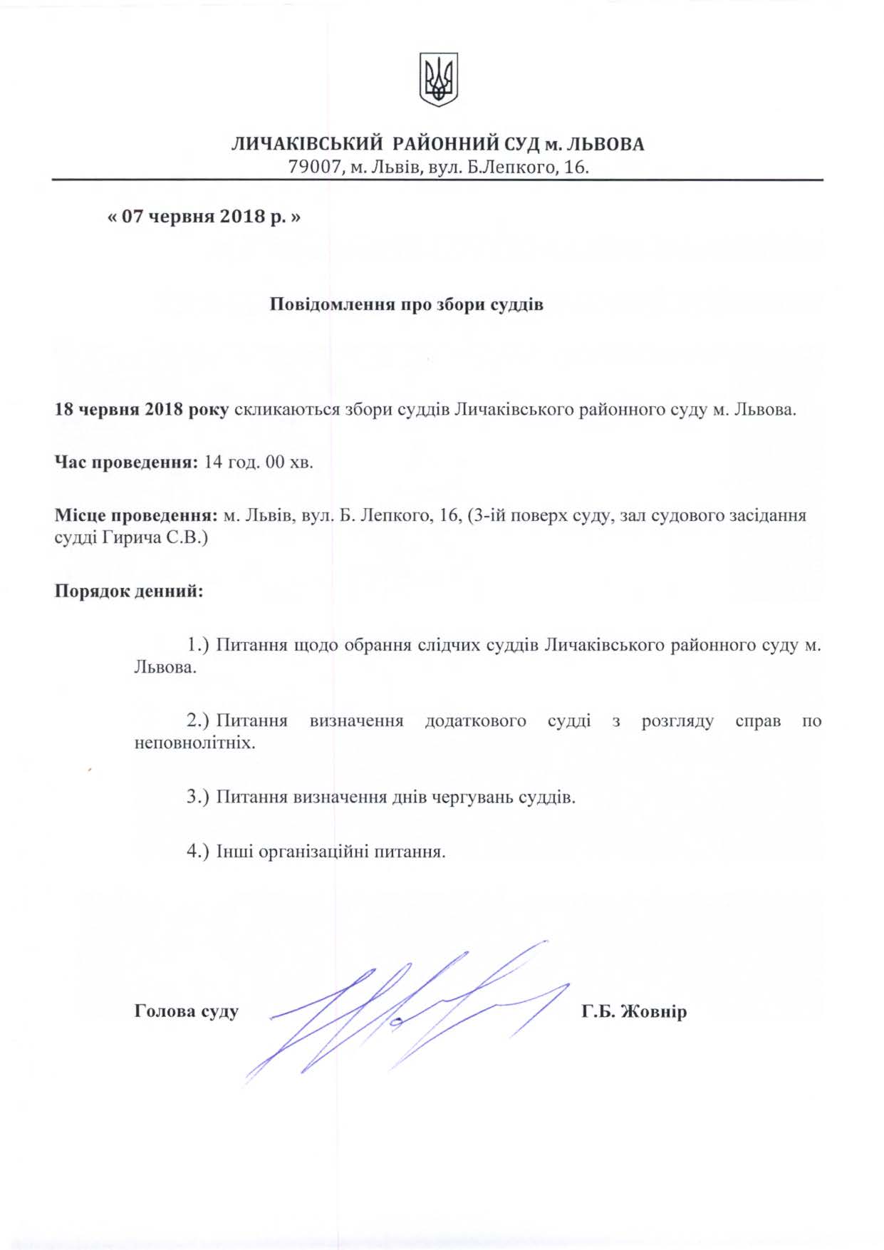 18 червня 2018 року відбудуться збори суддів Личаківського районного суду м. Львова