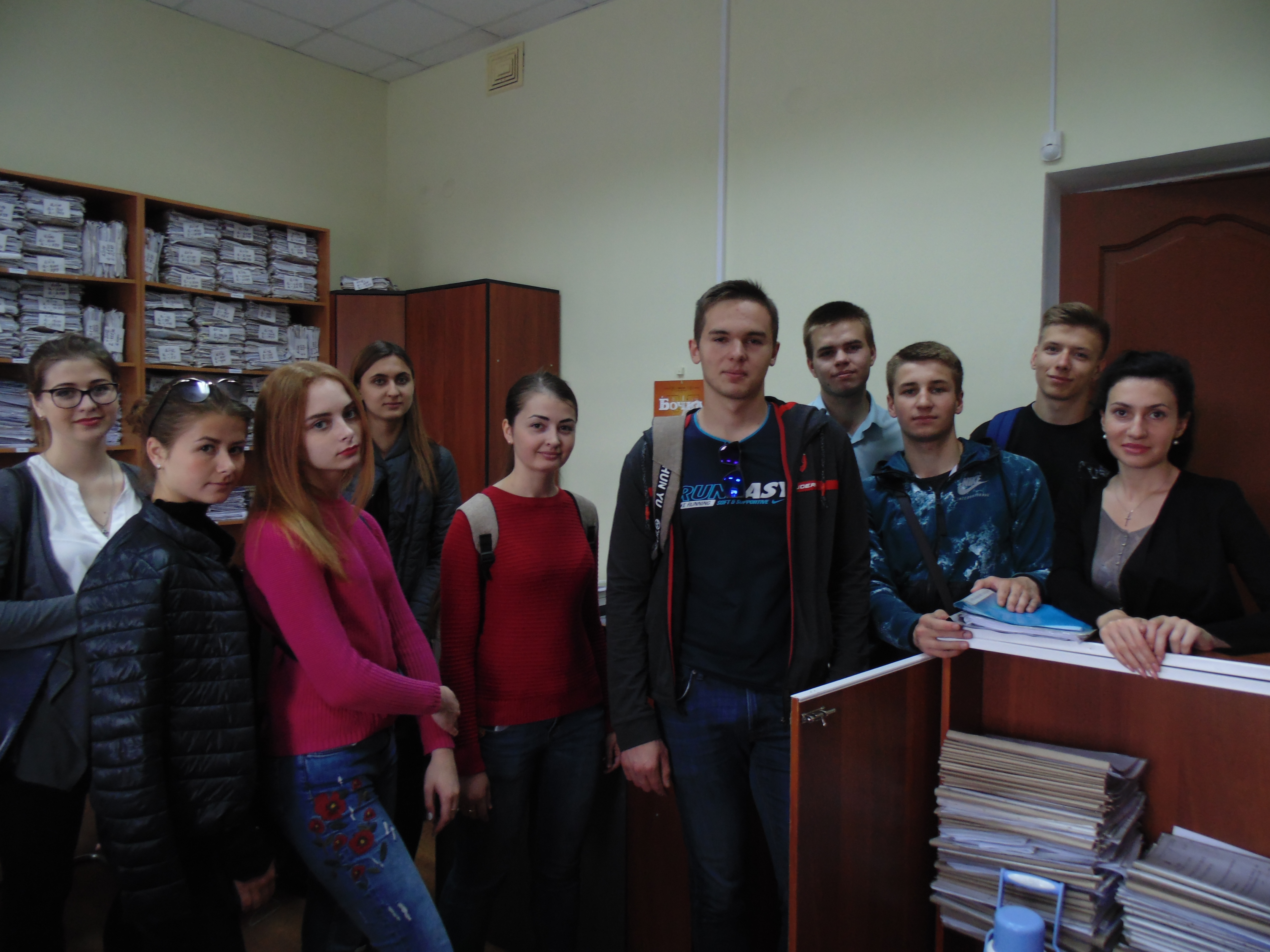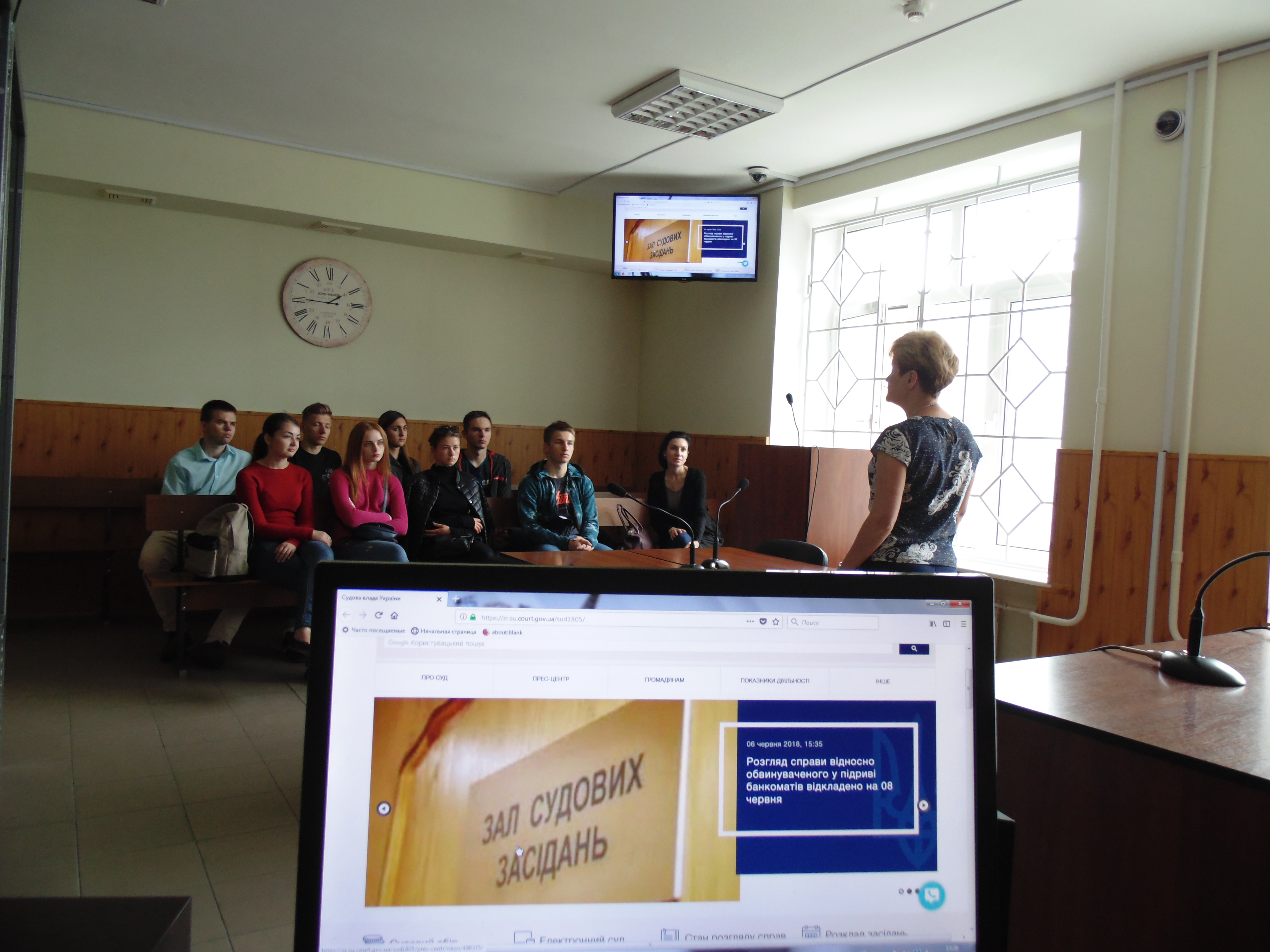 На початку зустрічі студенти відвідали архів суду та канцелярії суду, потім поспілкувалися із прес-секретарем суду Наталією Горкушею, яка розповіла про встановлений у приміщенні суду інформаційний кіоск за допомогою якого відвідувачі суду можуть самостійно переглянути список справ, призначених до розгляду; отримати інформацію про стан розгляду справ; здійснити електронний пошук справи за номером, датою призначення або за учасником процесу.