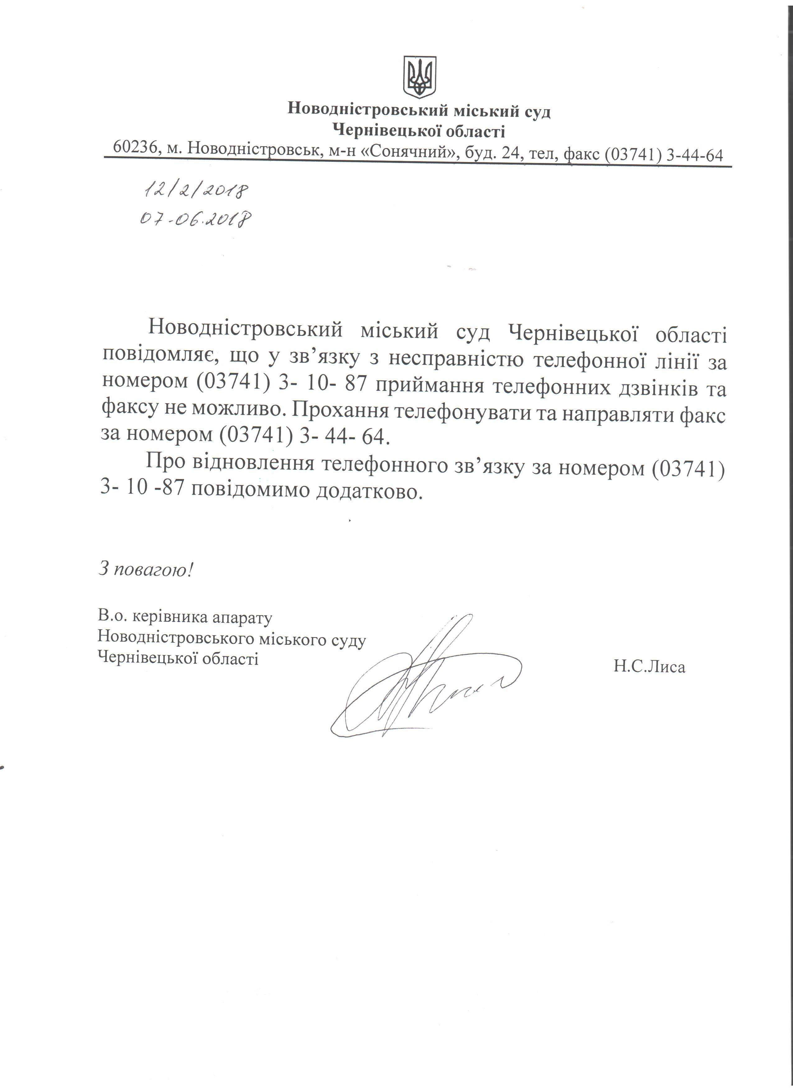 Новодністровський міський суд Чернівецької області повідомляє повідомляє щодо тимчасової відсутності телефонного зв’язку